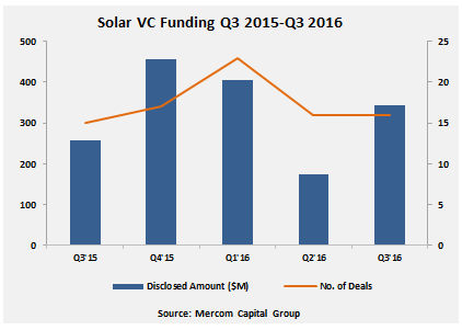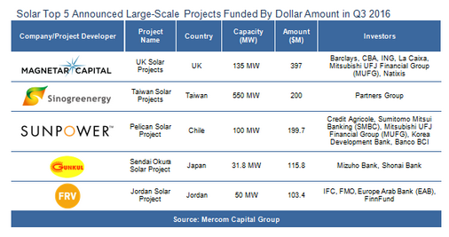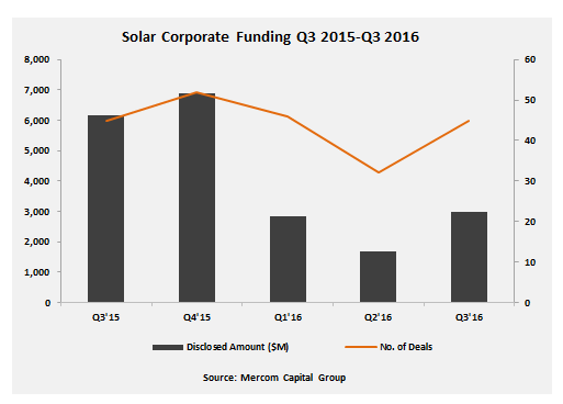 中國(guó)儲(chǔ)能網(wǎng)訊:根據(jù)全球清潔能源咨詢專家Mercom資本集團(tuán)日前發(fā)布二季度太陽(yáng)能并購(gòu)融資報(bào)告。報(bào)告中稱,今年第三季度,全球太陽(yáng)能企業(yè)融資規(guī)模(包括風(fēng)投、公共市場(chǎng)和債務(wù)融資)為30億美元,涉及交易45個(gè),環(huán)比增長(zhǎng)76.4%。