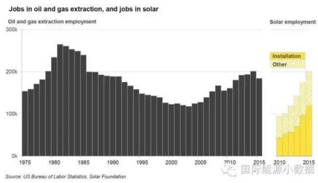 中國儲能網(wǎng)訊:根據(jù)美國勞工部和太陽能基金會的數(shù)據(jù),2015年美國太陽能(主要是光伏)領域就業(yè)人數(shù)達到20萬人,超過了油氣上游(開采)企業(yè)的就業(yè)人數(shù)。而在光伏就業(yè)崗位中,超過大約60%從事光伏安裝工作。