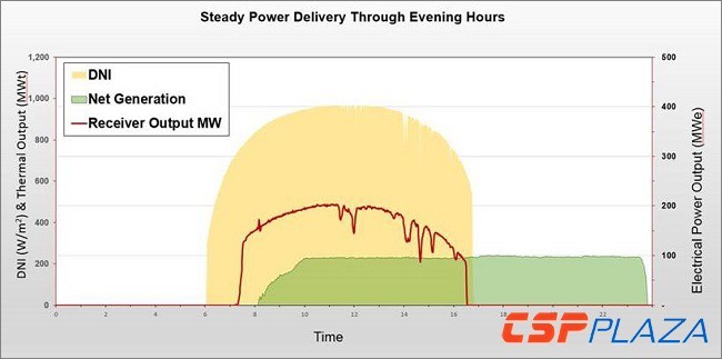 注:黃色是直接輻射(DNI),紅色是發(fā)電站的熔鹽所收集的熱能,綠色是輸送的電力。
