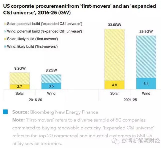如果亞馬遜、臉書和微軟等承諾使用可再生能源的美國公司,選擇通過目前日益流行的購電協(xié)議形式履行它們的能源使用承諾,則美國可再生能源發(fā)電設(shè)施就有機會在2025年前繼續(xù)拿到高達17GW的電廠級風(fēng)電和光伏購電協(xié)議。更重要的是,如果這些公司能夠激勵更多公司一起履行可再生能源義務(wù),美國的購電協(xié)議市場還將迎來更大發(fā)展。