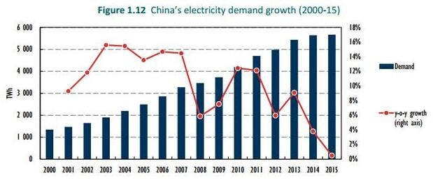 IEA提供的相關圖表顯示,2015年,中國電力需求同比增長放緩;而5年前,中國電力需求同比增長超過12%。