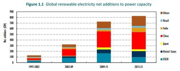 IEA預計,截止2021年,超過1/3的全球太陽能光伏和陸地風力發(fā)電產(chǎn)能將落戶中國。