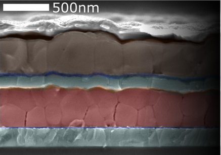 下面的紅色層面向短波長(zhǎng)光,上面的褐色層面向長(zhǎng)波長(zhǎng)光(攝影:Giles Eperon)