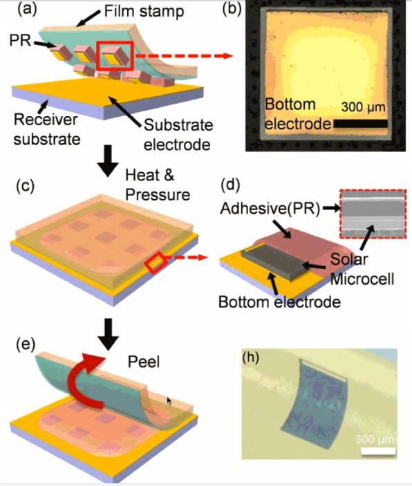 研究中制作太陽能微電池的材料是半導體砷化鎵,主要利用轉(zhuǎn)印transfer-printing這一技術,電池的重復使用是通過基板底部的電極反射光子回光伏電池來實現(xiàn)的。