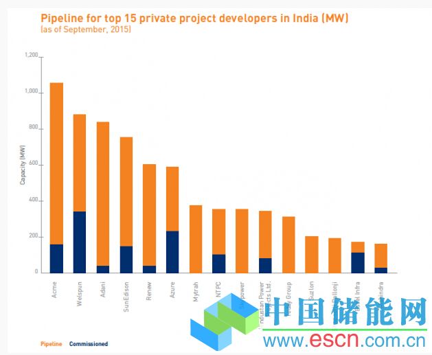 就項目儲備量而言,截至2015年9月(見上圖),Acme、Welspun、Adani、SunEdison和Renew領(lǐng)銜排名前十五位的私營項目開發(fā)商。