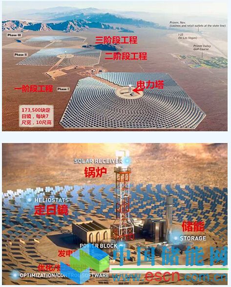 由美國BrightSource能源公司、NRG能源公司和Google共同參與投資的世界上最大的太陽熱電系統(tǒng)“艾文帕太陽能發(fā)電系統(tǒng)”(IvanpahSolarElectricGeneratingSystem,ISEGS)位于美國拉斯維加斯西南部40英里的莫哈韋沙漠,當地全年日照充分,距離輸電線路距離較近。ISEGS由3座太陽熱發(fā)電廠組成,它的成型和運作被視為提供了能和化石燃料競爭的新能源工程樣本,是在下一代科技、創(chuàng)新、政府、企業(yè)合作之下共同形成的,可以應對氣候變化的可持續(xù)解決方案。