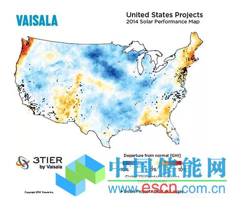 首先是糟糕的天氣。下圖可見,加州南部和內華達州2014年的輻照水平與過去15年的平均數據相比產生了很大的偏離。Ivanpah項目位于加州南部靠近內華達的邊界位置,正好是在地圖中的藍色部分。