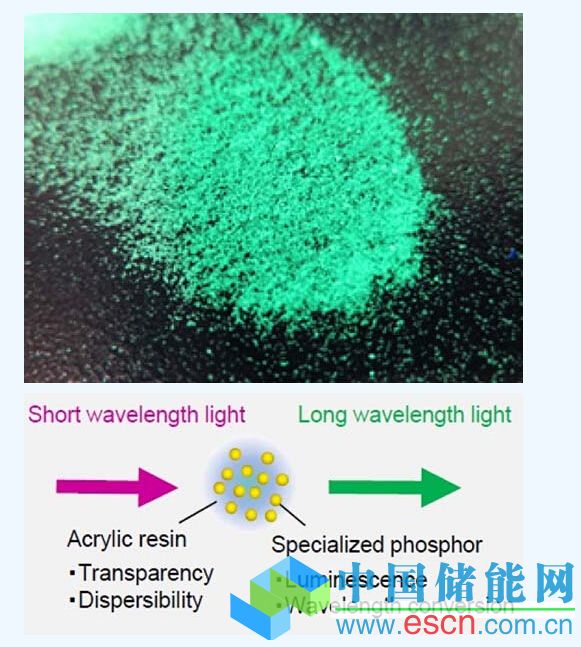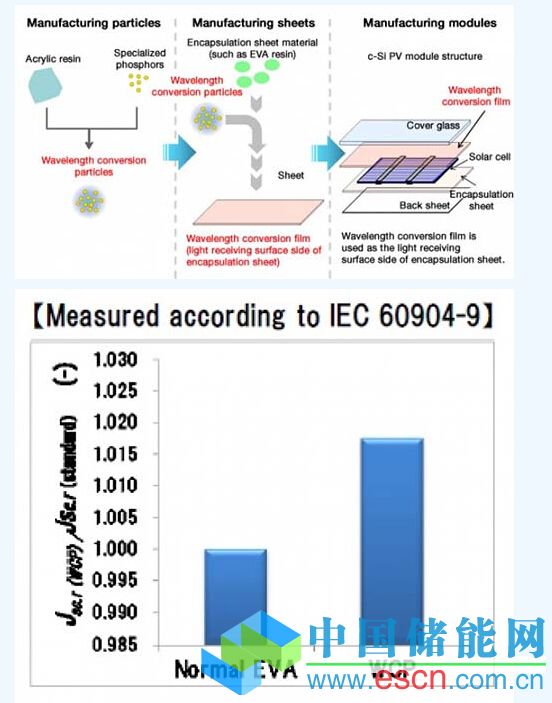 該公司表示,材料制造商將分布在丙稀酸樹脂粒子內(nèi)的熒光材料與EVA封裝片材混合,獲得短波長光(紫外線),并且將其轉換為長波長光(可見光),對現(xiàn)有薄膜配方的耐久性沒有影響。