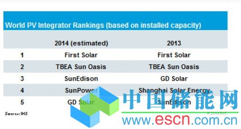 IHS預(yù)計的2014年頂尖EPC公司排名顯示中美公司之間在排名頂端正在進行的競爭,最終達到勢均力敵。