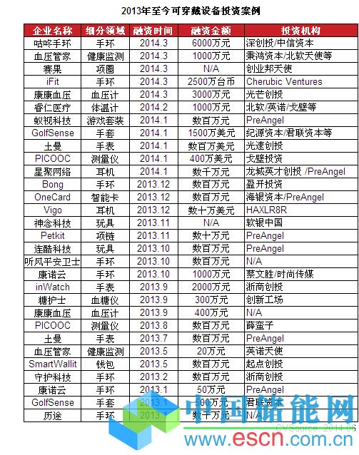此外,多支可穿戴基金的設(shè)立也進一步加快了巨頭在可穿戴市場創(chuàng)建生態(tài)系統(tǒng)的步伐:2013年4月,Google Ventures聯(lián)合Andreessen Horowitz、KPCB成立Glass Collective平臺,為谷歌眼鏡應(yīng)用開發(fā)者提供資金及服務(wù);2013年6月,Leap Motion的投資者高原資本投入2500萬美元成立了名為Leap Fund的基金,用于幫助企業(yè)搭建Leap Motion技術(shù)平臺,推動手勢識別技術(shù)應(yīng)用深入到教育、安全、醫(yī)療等多個行業(yè);2013年12月,富士康宣布將建立一支約2億新臺幣規(guī)模的投資基金,資助創(chuàng)業(yè)公司開發(fā)新型可穿戴技術(shù)、設(shè)備和軟件應(yīng)用,把觸角伸向軟件、云計算、電信服務(wù)和智能化的未來。