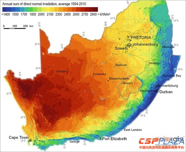 在Pofadder、Aggeneys和Springbok地區(qū),DNI值也很高。目前在Pofadder附近,Abengoa正在建設100MW的KaXu Solar One槽式光熱發(fā)電項目。