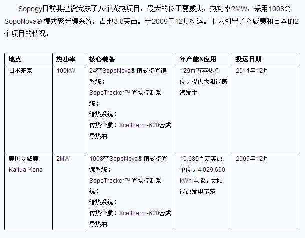 另外,Sopogy在德克薩斯州、墨西哥、巴布亞新幾內(nèi)亞、亞利桑那州、加利福尼亞州、阿聯(lián)酋分別建設(shè)了一個(gè)項(xiàng)目,主要應(yīng)用方向是太陽能空調(diào)和太陽能蒸汽發(fā)生、工業(yè)用熱等熱利用領(lǐng)域。