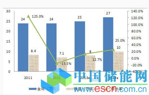 圖2 2011-2014年我國太陽能電池產(chǎn)量、增長率及全球太陽能電池產(chǎn)量