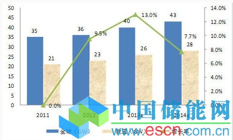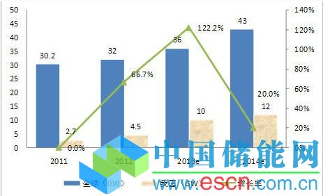 圖3 2011-2014年我國光伏新增裝機(jī)量、增長率及全球新增裝機(jī)量