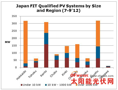 日本政府在今年7月開(kāi)始實(shí)施全國(guó)上網(wǎng)電價(jià)。僅在7月到9月期間,就有接近1.5 GW的光伏項(xiàng)目申報(bào)并得到了補(bǔ)貼資格,占到了日本政府計(jì)劃在2012年7月到2013年3月期間安裝量的60%。在這1.5 GW的光伏項(xiàng)目中,規(guī)模大于1 MW的項(xiàng)目比例超過(guò)了50%。 具體到各個(gè)地區(qū)來(lái)看,九州島地區(qū)獲得補(bǔ)貼資格的項(xiàng)目總?cè)萘孔疃唷?北海道地區(qū)獲批的大型地面項(xiàng)目超過(guò)其他區(qū)域,主要得益于大量可利用的空地資源。而在人口密度相對(duì)較高的關(guān)東地區(qū),核準(zhǔn)的項(xiàng)目以小型屋頂項(xiàng)目為主。