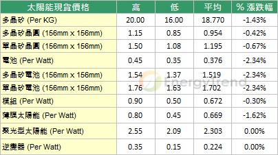 由于長(zhǎng)假與產(chǎn)能調(diào)整的關(guān)系,近期交易清淡,本周多晶硅晶圓的平均價(jià)格來(lái)到$0.954/piece,小跌0.42%;單晶硅晶圓方面,業(yè)者表示雖然需求不佳,但相關(guān)產(chǎn)品的價(jià)格持續(xù)調(diào)降,本周平均價(jià)格跌破$1.2/piece,來(lái)到$1.195/piece,跌幅為0.67%。而在電池與模塊方面,中國(guó)與臺(tái)灣業(yè)者在價(jià)格幾乎同步,目前主要價(jià)格區(qū)間集中在$0.36/Watt至$0.38/Watt之間,使得本周電池平均價(jià)格來(lái)到$0.376/Watt,跌幅為2.34%,為本周跌幅較為明顯的產(chǎn)品;在模塊方面,近期價(jià)格已出現(xiàn)明顯調(diào)整,再加上長(zhǎng)假與展會(huì)效應(yīng),本周價(jià)格出現(xiàn)觀望,目前平均價(jià)格為$0.672/Watt,跌幅為0.3%,受到硅晶模塊價(jià)格壓力,部分中國(guó)薄膜業(yè)者也選擇降價(jià)因應(yīng),使得本周薄膜產(chǎn)品的平均價(jià)格出現(xiàn)下來(lái),來(lái)到$0.669/Watt,跌幅為1.62%。