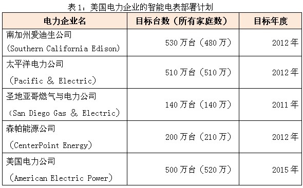 另一方面,由于對設(shè)備等硬件設(shè)施的投資大多是20年以上的長期投資,因而美國希望通過獲取需求側(cè)轉(zhuǎn)移電力峰值,來有效控制整體的投資規(guī)模。為此,美國電力企業(yè)意識到,即使自行投資進行AMI搭建,因能夠達到電力峰值控制等效果,也可以不斷接受政府經(jīng)濟刺激計劃的補貼,所以它們紛紛快速部署著智能電表(表1),讓家庭用戶首先實現(xiàn)電網(wǎng)智能化。