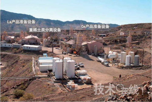 通過(guò)懸掛著美國(guó)國(guó)旗和Molycorp公司旗幟的入口后,處理稀土原礦石的老式設(shè)備便出現(xiàn)在眼前(圖2)。該設(shè)備目前仍在用過(guò)去存儲(chǔ)的礦石生產(chǎn)稀土。
