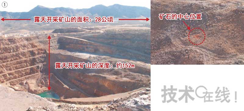 旨在挖掘含有稀土的原礦石的露天開(kāi)采礦山(①)。深度為152m。②中紅色圓圈部分是為了挖掘稀土原礦石而安防炸藥的地方。