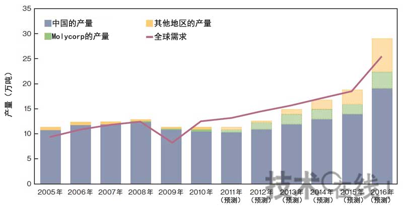 雖然中國(guó)和Molycorp的增產(chǎn)部分可以彌補(bǔ)不足,但稀土的供應(yīng)不足情況目前仍將持續(xù)。(由本雜志根據(jù)Molycorp的資料制作而成。REO(稀土氧化物)的產(chǎn)量。2015年之前的誤差范圍為±20%,2016~2020年的誤差范圍為±25%)