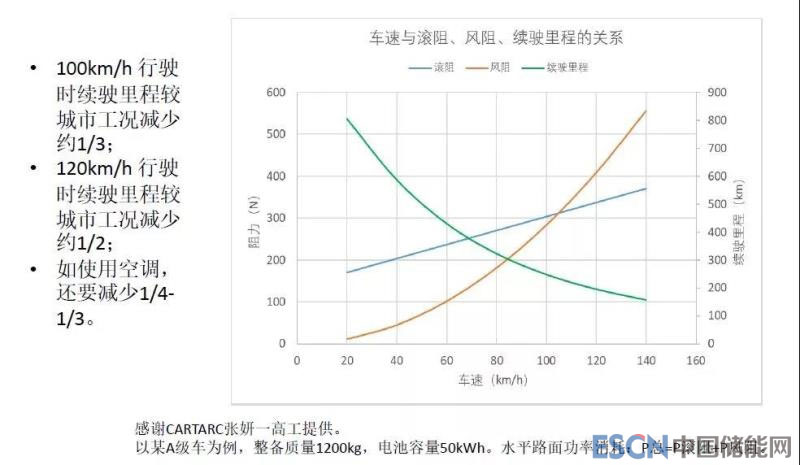 圖中的數(shù)據(jù)不一定非常準(zhǔn)確,但可以看到隨著車速增長能耗迅速增加,續(xù)駛里程就迅速下降。簡單的道理就是高速行駛下汽車的能量主要消耗于克服風(fēng)阻,風(fēng)阻消耗的功率跟風(fēng)速的立方成正比。尤其是SUV類車型風(fēng)阻系數(shù)與迎風(fēng)面積都比較大。電動汽車以100-120公里/時的車速在高速公路行駛,續(xù)駛里程要較標(biāo)準(zhǔn)工況下減少1/4到1/3,原來400公里的續(xù)駛里程在這種工況下可能就剩下不到300公里,這個現(xiàn)象我認(rèn)為是正常的,如果要改進(jìn)就要想辦法降低風(fēng)阻。
