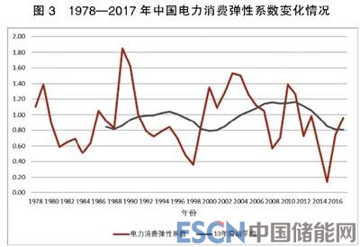 從1978年到2017年我國(guó)電力消費(fèi)彈性系數(shù)(全社會(huì)用電量增速/GDP增速)來(lái)看,各年的彈性系數(shù)值在0—2之間,且年際間波動(dòng)較大,體現(xiàn)不出電力消費(fèi)是經(jīng)濟(jì)增長(zhǎng)“晴雨表”的穩(wěn)定關(guān)系;但10年滑動(dòng)平均彈性系數(shù)曲線在0.8—1.2之間,且呈現(xiàn)出較規(guī)律性的波動(dòng),既反映出了“晴雨表”特性,也反映出彈性系數(shù)的周期性變化(見圖3)。