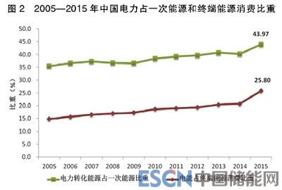 當(dāng)前我國(guó)與發(fā)達(dá)國(guó)家電能在終端能源消費(fèi)中的比重持平,且我國(guó)還略高于英國(guó)等發(fā)達(dá)國(guó)家。這種現(xiàn)象使一些專家認(rèn)為,我國(guó)電能占終端能源比重不會(huì)再提高。筆者認(rèn)為,發(fā)達(dá)國(guó)家天然氣在終端能源消費(fèi)中的比重約為25%,而我國(guó)在7%左右,我國(guó)計(jì)劃在2020年力爭(zhēng)達(dá)到10%,2030年達(dá)到15%左右。制約天然氣發(fā)展的主要因素是資源、價(jià)格以及相對(duì)于可再生能源碳排放仍然較高的特性。要提高我國(guó)終端能源消費(fèi)的清潔化,需要同步提高可再生能源發(fā)電比重及電能在終端能源消費(fèi)中的比重(見圖2)。