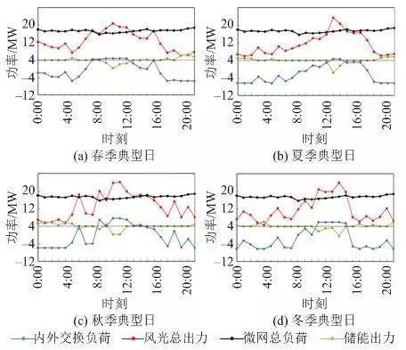 圖9和圖10為傳統(tǒng)運(yùn)營(yíng)模式和一體化運(yùn)營(yíng)模式下,春、夏、秋、冬四季典型日微網(wǎng)的運(yùn)行情況(儲(chǔ)能出力負(fù)值表示充電,內(nèi)外交換負(fù)荷負(fù)值表示外