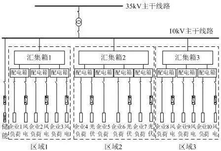 微網(wǎng)分為3塊區(qū)域,均為大工業(yè)用戶,電壓等級(jí)為10kV,最大負(fù)荷為11.13MW。項(xiàng)目壽命周期為20年,設(shè)備綜合造價(jià)及相關(guān)成本參考當(dāng)?shù)貥?biāo)準(zhǔn),基準(zhǔn)折現(xiàn)率取7%。傳統(tǒng)運(yùn)營(yíng)模式下微網(wǎng)項(xiàng)目總投資約1.62億元,其中源側(cè)約14500萬元,網(wǎng)側(cè)投約310萬元,儲(chǔ)側(cè)約900萬元,信息化平臺(tái)(能量管理系統(tǒng))約500萬元;一體化運(yùn)營(yíng)模式總投資約1.68億元,其中源網(wǎng)儲(chǔ)側(cè)投資變化不大,信息化平臺(tái)(大數(shù)據(jù)云計(jì)算平臺(tái)、微平衡市場(chǎng)交易系統(tǒng)、能量管理系統(tǒng))約1100萬元。圖7為微網(wǎng)接線方案示意圖。