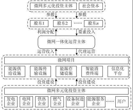 目前我國(guó)已投資建設(shè)大量微網(wǎng)項(xiàng)目,其中大部分微網(wǎng)“源-網(wǎng)-荷-儲(chǔ)”各環(huán)節(jié)能源設(shè)施由單一主體投資建設(shè)運(yùn)營(yíng)。但是分布式能源、傳輸網(wǎng)絡(luò)、儲(chǔ)能等能源設(shè)施投資規(guī)模大,缺乏合理投資回報(bào)模式,微網(wǎng)項(xiàng)目主體將承擔(dān)較大投資風(fēng)險(xiǎn)。因此,本文提出微網(wǎng)運(yùn)營(yíng)一體化和投資多元化的模式框架。