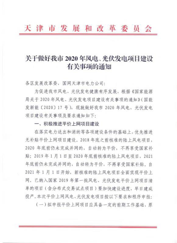 2020年4月1日,天津市發(fā)改委下發(fā)了《關(guān)于做好2020年風(fēng)電、光伏發(fā)電項(xiàng)目建設(shè)有關(guān)事項(xiàng)的通知》。根據(jù)通知要求,在落實(shí)電力送出和消納等各項(xiàng)建設(shè)條件的基礎(chǔ)上,優(yōu)先推進(jìn)無(wú)補(bǔ)貼平價(jià)上網(wǎng)項(xiàng)目建設(shè)。擬申報(bào)平價(jià)上網(wǎng)項(xiàng)目應(yīng)具備一定的前期工作基礎(chǔ),且應(yīng)開(kāi)展電力接入和消納能力分析,具備接入和消納條件。