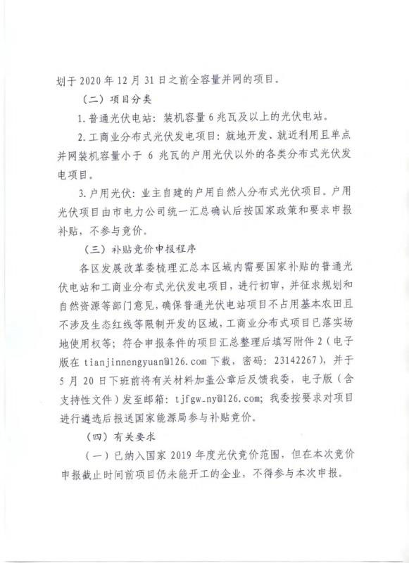 文件中指出,平價(jià)項(xiàng)目于4月20日前報(bào)送,競(jìng)價(jià)項(xiàng)目于5月20日前報(bào)送。其中,擬申報(bào)平價(jià)上網(wǎng)風(fēng)電項(xiàng)目應(yīng)開(kāi)展風(fēng)資源評(píng)價(jià),具備開(kāi)發(fā)價(jià)值,項(xiàng)目須在2020年底前完成核準(zhǔn)且開(kāi)工建設(shè);光伏發(fā)電項(xiàng)目應(yīng)完成備案,并在2020年底前開(kāi)工建設(shè)。項(xiàng)目申報(bào)企業(yè)應(yīng)出具按期開(kāi)工承諾,逾期未開(kāi)工的2年內(nèi)不得參與天津市風(fēng)電、光伏發(fā)電項(xiàng)目建設(shè)。競(jìng)價(jià)光伏項(xiàng)目范圍為2020年度需要國(guó)家補(bǔ)貼的新建光伏發(fā)電項(xiàng)目,包括2020年1月1日以來(lái)已建成并網(wǎng)的項(xiàng)目和尚未并網(wǎng)計(jì)劃于2020年12月31日之前全容量并網(wǎng)的項(xiàng)目。