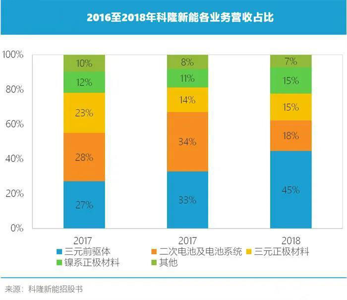 其中,科隆新能的三元前驅(qū)體業(yè)務(wù)近年來發(fā)展迅速,其營收從2016年的3.06億元增長至2018年的6.35億元,一躍成為科隆新能第一營收來源,占總營收的41%。