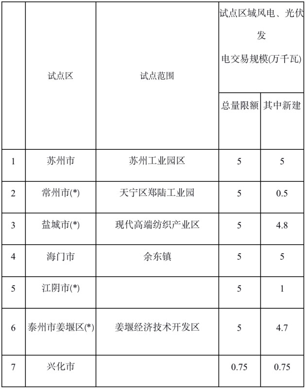 江蘇分布式發(fā)電市場(chǎng)化交易文件將很快發(fā)布,共7個(gè)試點(diǎn)將于今年落地,包括蘇州工業(yè)園區(qū)、常州市天寧鄭陸工業(yè)園、鹽城市現(xiàn)代高端紡織產(chǎn)業(yè)區(qū)、海門市余東鎮(zhèn)、江陰市、姜堰經(jīng)濟(jì)技術(shù)開發(fā)區(qū),以及興化市。其中,蘇州工業(yè)園區(qū)和海門市余東鎮(zhèn)交易規(guī)模均5萬千瓦,鹽城市現(xiàn)代高端紡織產(chǎn)業(yè)區(qū)和姜堰經(jīng)濟(jì)技術(shù)開發(fā)區(qū)交易規(guī)模分別為4.8萬千瓦和4.7萬千瓦,其余試點(diǎn)交易規(guī)模較小,均1萬千瓦以下。