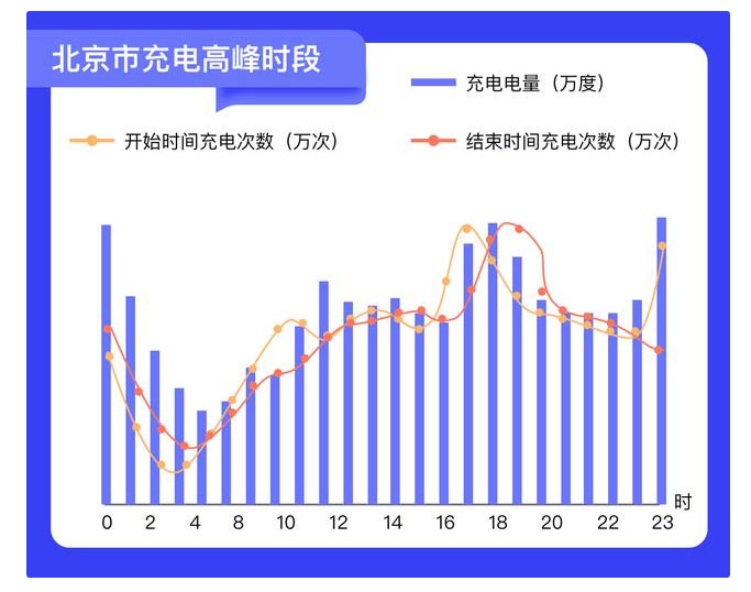 每天市民在充電時段上也出現(xiàn)“冷熱不均”,呈現(xiàn)出充電的“早晚高峰”。以天為單位進行觀測,北京市充電開始的高峰時段為早上8:00-9:00、下午15:00-16:00和晚上23:00-0:00點;而充電結(jié)束的高峰時段為早上9:00-10:00、下午16:00-17:00和晚上0:00-1:00點。