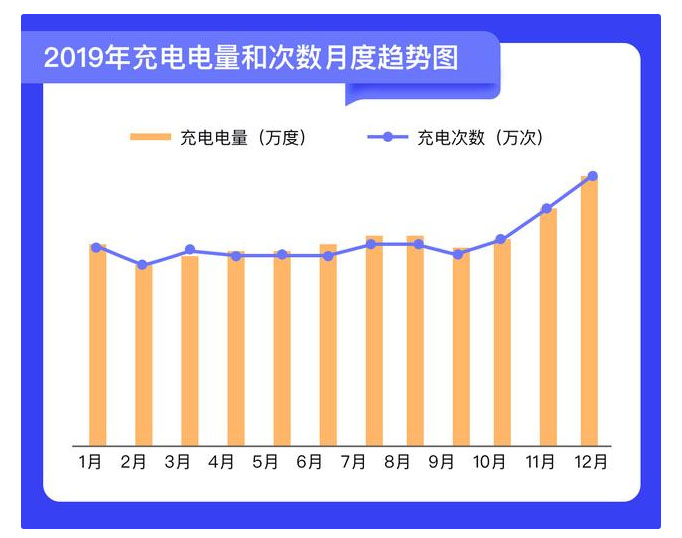 截至2019年12月,從使用趨勢來看,充電電量和充電次數(shù)均呈現(xiàn)平穩(wěn)上升趨勢,且受季節(jié)性因素影響較大。由于新能源汽車冬季電池耗電量高、掉電量快,進入11月份之后,用電量和用電次數(shù)環(huán)比增幅均達到10%以上,12月達到用電峰值。