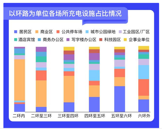 具體來看,三環(huán)內(nèi)的社會公用充電設(shè)施主要集中在商業(yè)區(qū),其中在二環(huán)內(nèi)在商業(yè)區(qū)的建設(shè)占比為50%;三環(huán)至六環(huán)的社會公用充電設(shè)施,集中建設(shè)在居民區(qū)和商業(yè)區(qū),其中四環(huán)至五環(huán)有37%的充電設(shè)施建設(shè)在居民區(qū);六環(huán)外的充電設(shè)施主要建設(shè)在居民區(qū)(25%)、公共停車場(22%)和城市公園綠地(18%)。