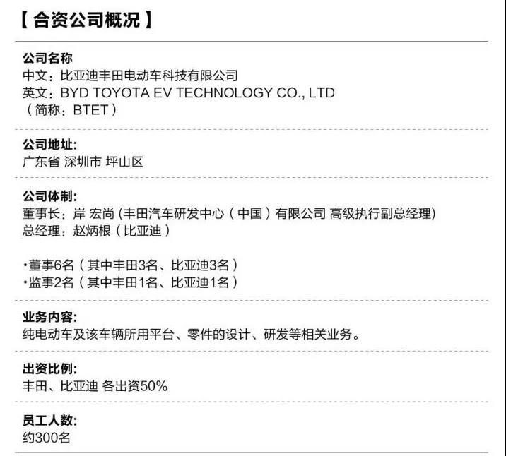 雙方認(rèn)為合作是“對(duì)等合作”,這不僅體現(xiàn)在技術(shù)和品牌上,即更多使用比亞迪的技術(shù),產(chǎn)品使用豐田品牌,同時(shí)也體現(xiàn)在管理架構(gòu)上,合資公司董事6名,雙方各3名;監(jiān)事2名,雙方各1名。