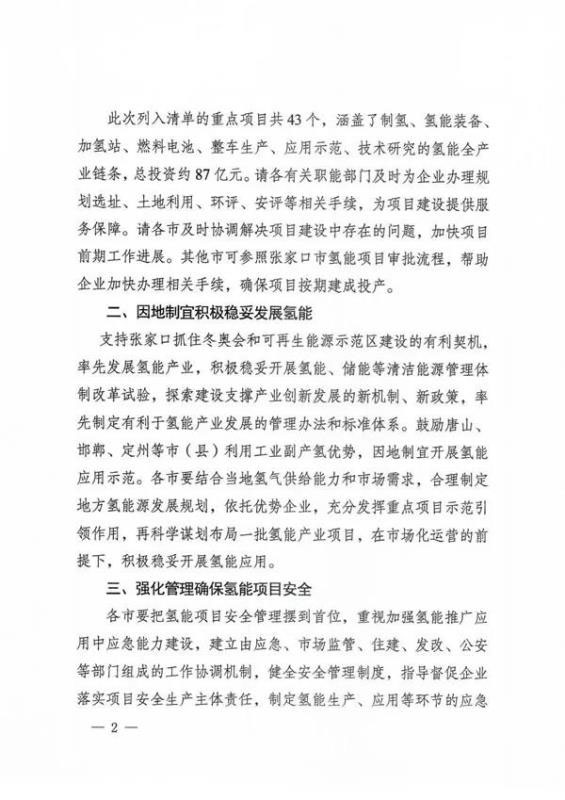 河北省發(fā)展改革委近日印發(fā)通知,公布了《河北省2020年氫能產(chǎn)業(yè)重點(diǎn)項(xiàng)目清單(第一批)》。此次列入清單的重點(diǎn)項(xiàng)目共43個(gè),涵蓋制氫、氫能裝備、加氫站、燃料電池、整車生產(chǎn)、應(yīng)用示范、技術(shù)研究的氫能全產(chǎn)業(yè)鏈條,總投資約87億元。其中在張家口市布局項(xiàng)目21個(gè)。