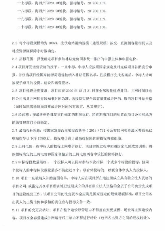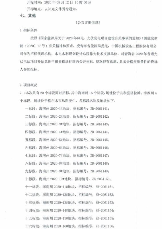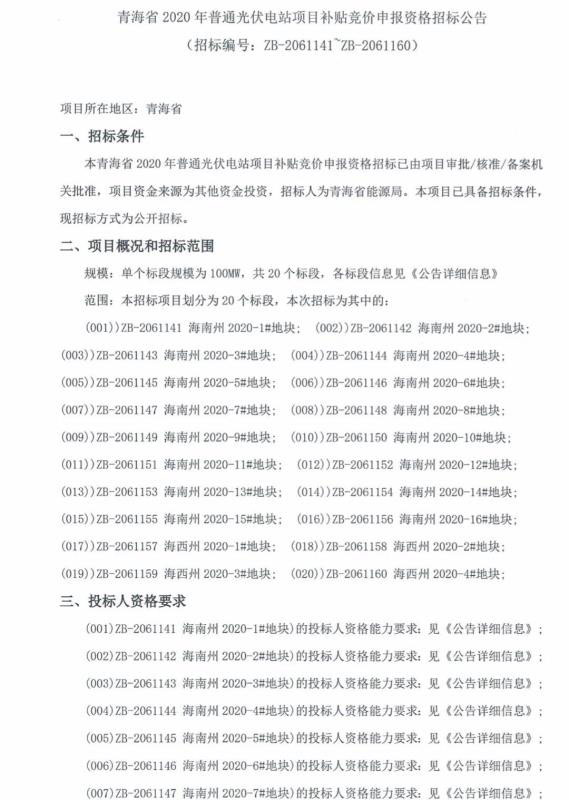 4月5日,青海能源局發(fā)布2020年普通電站項(xiàng)目補(bǔ)貼競價申報(bào)資格招標(biāo)公告,此次招標(biāo)規(guī)模為2GW,包括20個標(biāo)段、單個標(biāo)段規(guī)模100MW,其中海南州16個,海西州4個。