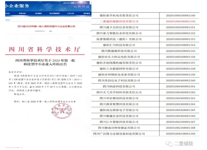 中國儲能網訊:近日,二重德陽儲能有限公司(簡稱“二重儲能”)順利通過2020年四川省第一批國家科技型中小企業(yè)認定。