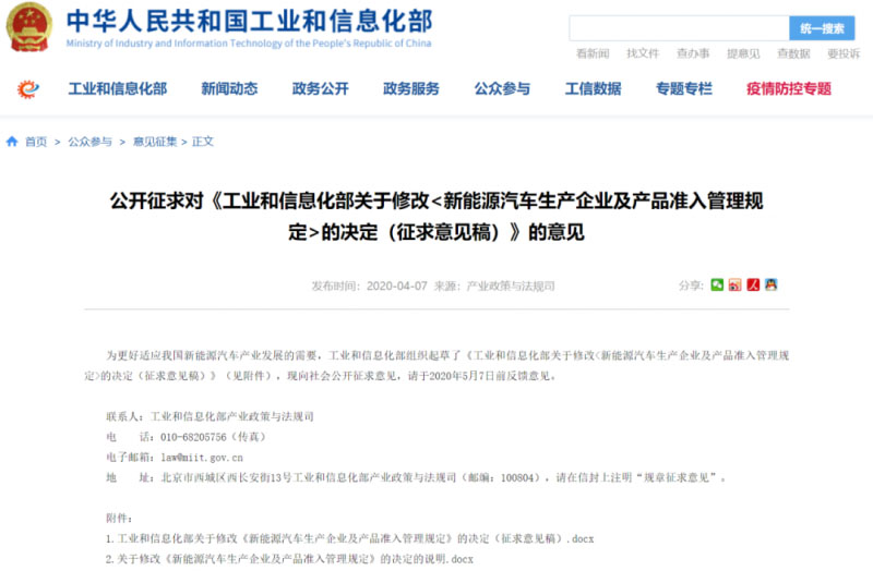 4月7日,工業(yè)和信息化部發(fā)布了關(guān)于修改《工業(yè)和信息化部關(guān)于修改<新能源汽車生產(chǎn)企業(yè)及產(chǎn)品準(zhǔn)入管理規(guī)定>的決定(征求意見稿)》的通知。即日起,該《征求意見稿》面向社會(huì)公開征求意見,于2020年5月7日前截止。