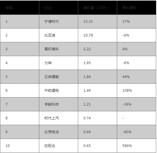 2019全年新能源汽車?yán)塾嬌a(chǎn)約117.7萬臺,同比下降4%。全年累計動力電池裝機(jī)量約62.38GWh,同比增長9%。其中,TOP10企業(yè)合計裝機(jī)達(dá)54.88GWh,占整體裝機(jī)量的87.98%。