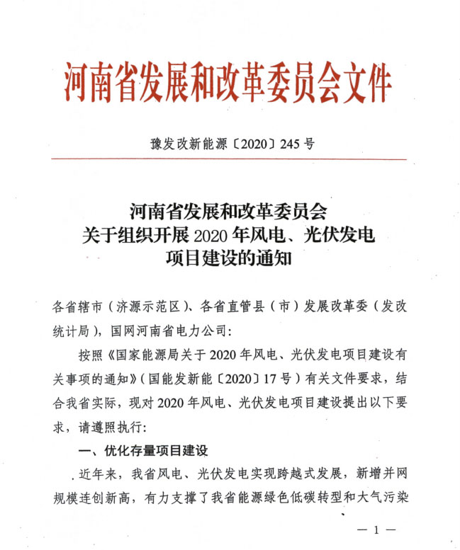 4月7日,河南省發(fā)改委下發(fā)《關(guān)于組織開展2020年風(fēng)電、光伏發(fā)電項目建設(shè)的通知》。