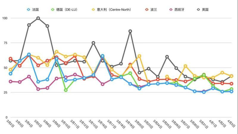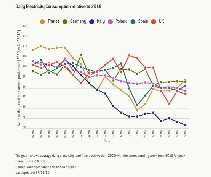 專(zhuān)注于經(jīng)濟(jì)學(xué)研究的歐洲獨(dú)立智庫(kù)布魯蓋爾(Bruegel)比較了歐洲六個(gè)國(guó)家的用電負(fù)荷,與2019年相比下降趨勢(shì)明顯,如圖1所示。3月23日以后上述六個(gè)國(guó)家的工作日用電負(fù)荷均低于去年同期。