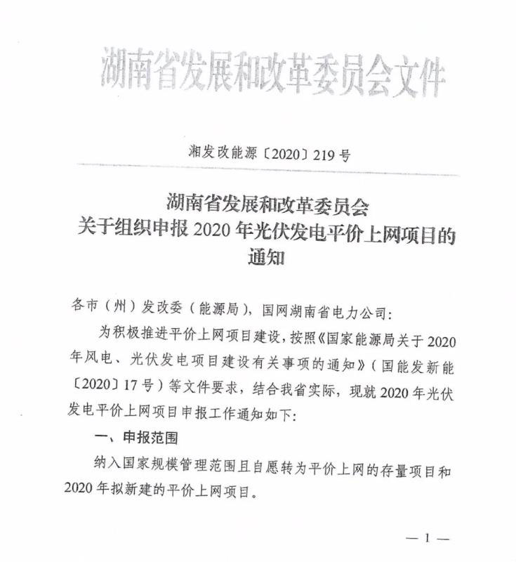 4月8日,湖南發(fā)改委下發(fā)《關(guān)于組織申報2020年光伏發(fā)電平價上網(wǎng)項目的通知》(以下簡稱“《通知》”),指出納入國家規(guī)模管理范圍且自愿轉(zhuǎn)為平價上網(wǎng)的存量項目和2020年擬新建的平價項目可以申報今年湖南省光伏發(fā)電平價上網(wǎng)項目。2020年湖南電網(wǎng)新增建設(shè)規(guī)模80萬千瓦(800MW),電網(wǎng)新增建設(shè)規(guī)模為0的區(qū)域不得申報平價項目。