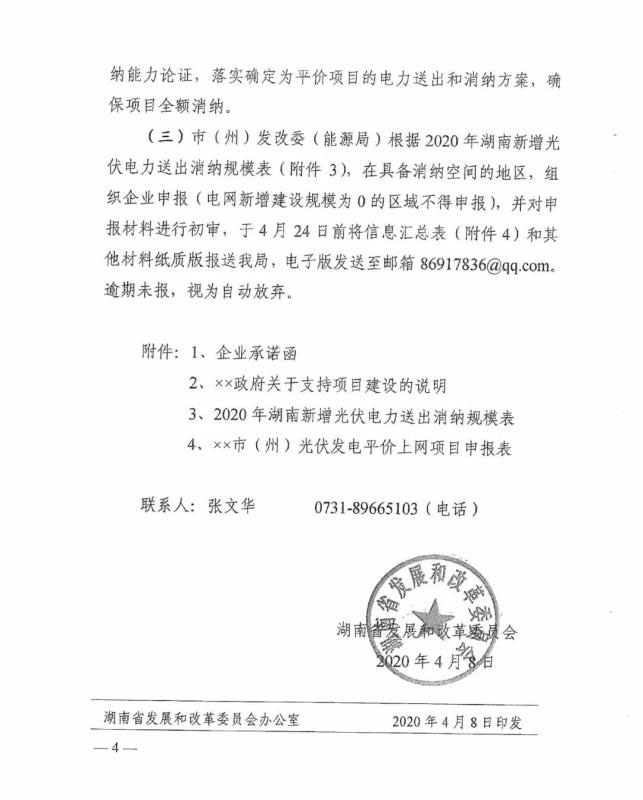 各市(州)發(fā)改委(能源局)根據(jù)2020年湖南新增光伏電力送出消納規(guī)模表,組織企業(yè)申報,對申報材料初審后,于4月24日前報送。