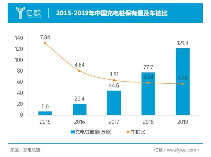 截至2015年底,我國(guó)公共類充電設(shè)施保有量?jī)H5.7萬臺(tái)。這一數(shù)字在2019年底已達(dá)到121.9萬臺(tái),增長(zhǎng)了21倍。在充電樁高速建設(shè)的同時(shí),全國(guó)車樁比水平也在持續(xù)優(yōu)化,已由2015年的7.8:1提升至2019年底的3.4:1。
