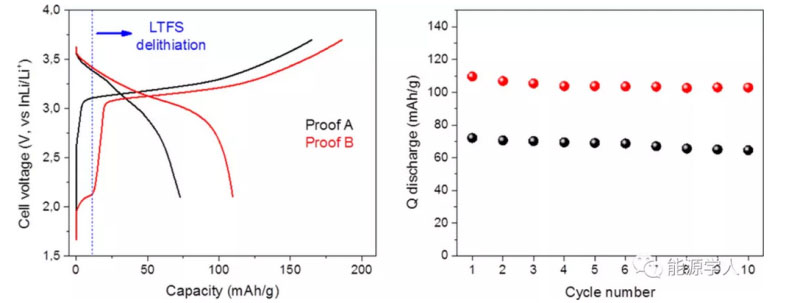 為了證明作者的想法,實驗中組裝了兩個全固態(tài)電池(稱為proof A和proof B),第一個是不含LTFS的,后者則在正極中添加7%的LTFS。
