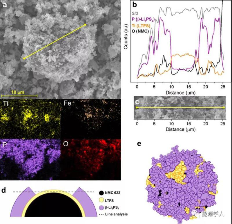 上文已經(jīng)證明了LTFS作為正極材料在固態(tài)鋰電池中的優(yōu)異性能,這依賴于其循環(huán)過程中的高穩(wěn)定性。此時,作者進一步提出,是否有可能使用LTFS作為鋰插層氧化物正極材料的保護涂層。在這種情況下,LTFS將取代目前使用的電化學(xué)惰性涂層(LiNbO3,Al2O3),同時作為活性緩沖層降低NMC/β-Li3PS4的界面電阻。作者選用NMC 622(粒徑:d50 12μm)作為活性物質(zhì)與LTFS混合。圖5顯示了LTFS包覆的NMC粒子上的EDX圖和線分析。掃描元素分別為P、Ti/Fe和O,它們分別說明了β-LPS、LTFS和NMC的存在。